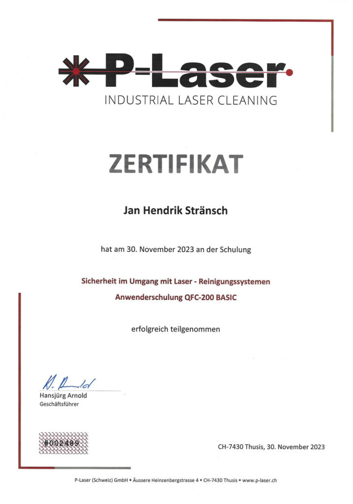 Permanente Anwenderschulung, Weiterbildung und reger Austausch mit dem Hersteller haben uns inzwischen zu einem der offiziellen Servicepartner der P-Laser GmbH erklärt. Unsere Kernkompetenz liegt in der Oberflächenreinigung unterschiedlichster Substanzen mit unserem Laserreinigungssystem. Bei Ihnen vor Ort oder in unseren Räumlichkeiten.